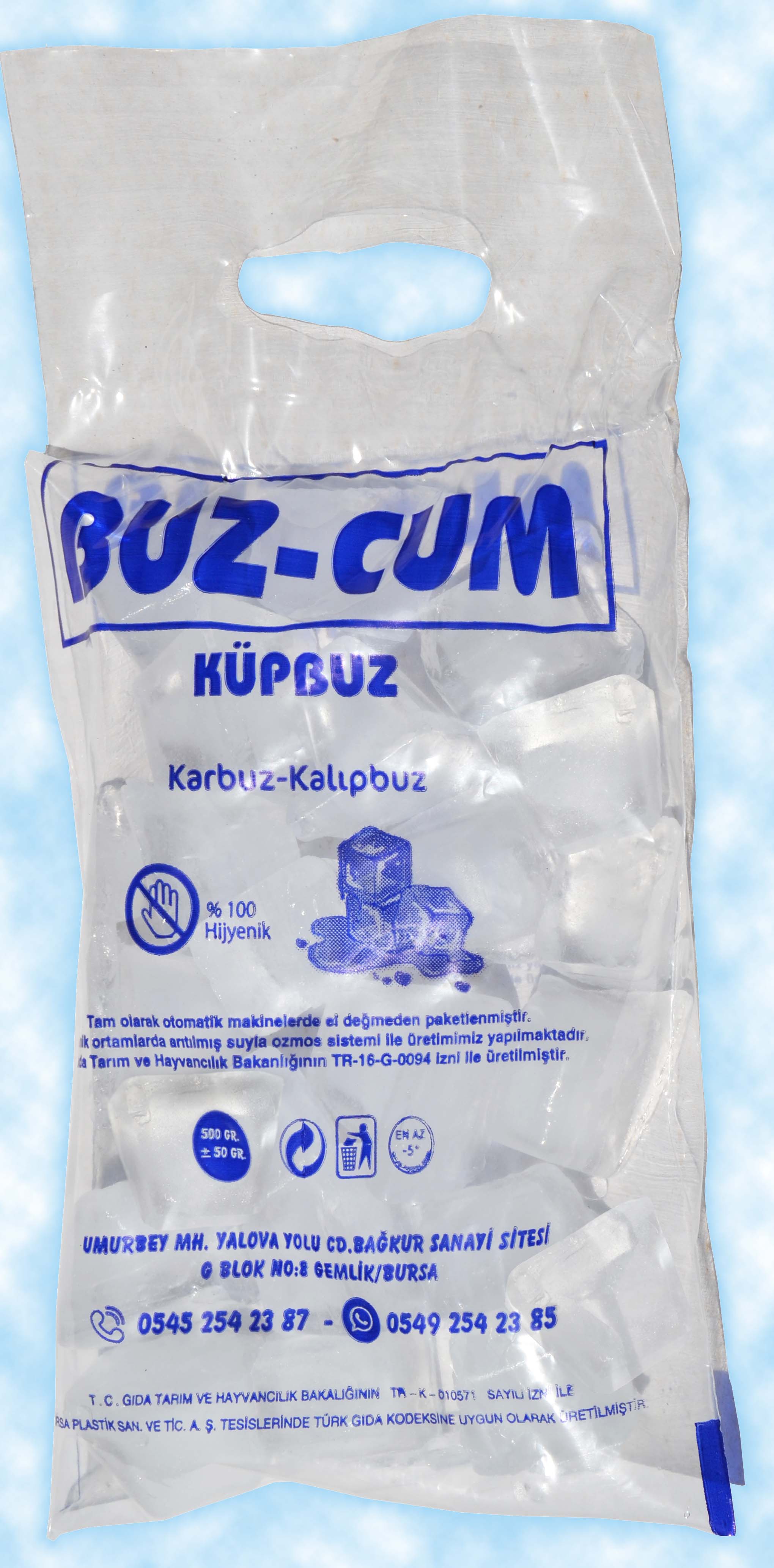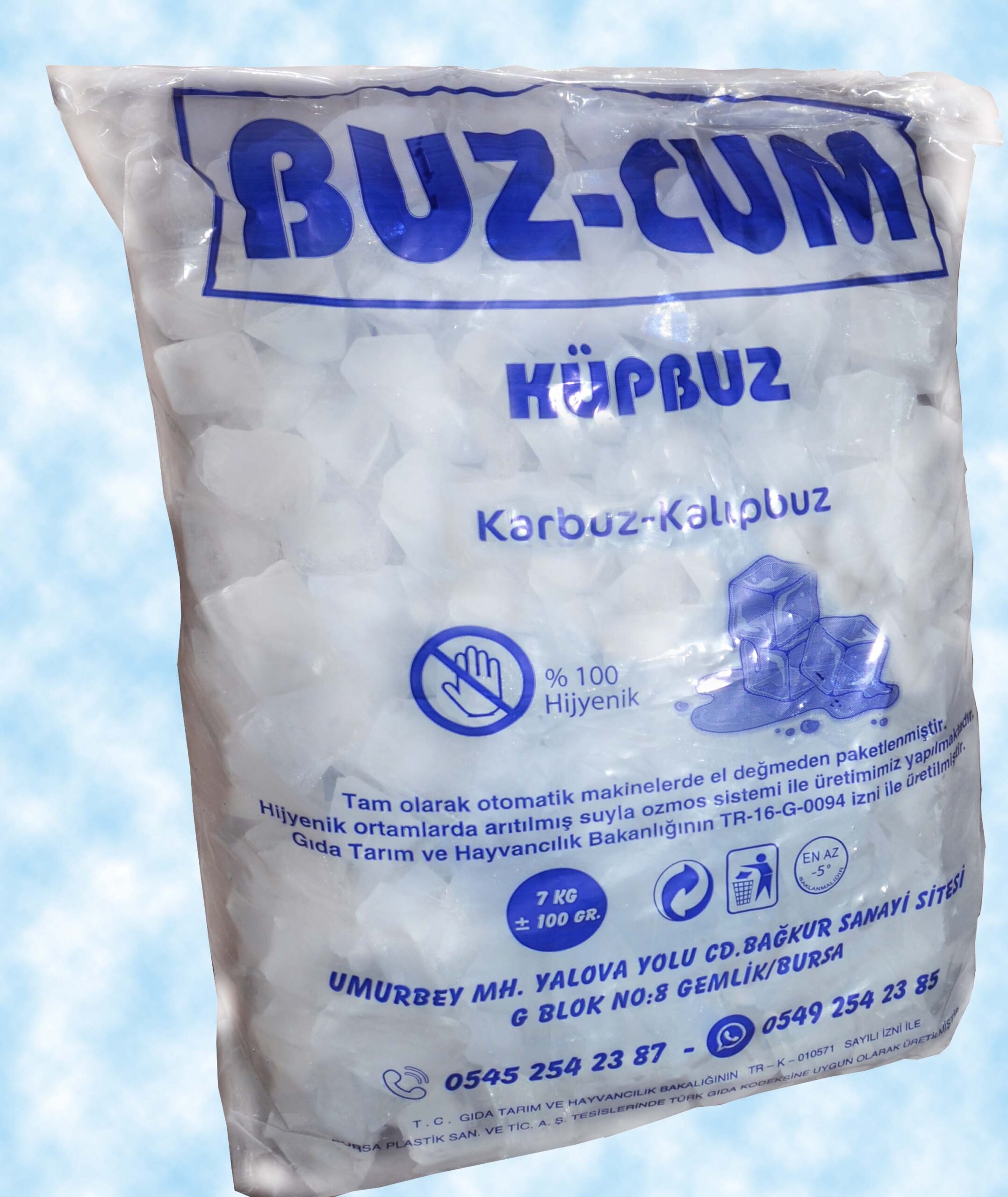 Hijyenik ortamda, buz yapmaya uygun, ozonla zenginleştirilmiş su ile ürettiğimiz ambalajlı buz kaplarında kullanıma sunmuş olduğumuz Buzcum; içme suyu yönetmeliğine uygun şişe su kalitesine sahiptir. Buzcum’u aşırı sıcak olmayan, direk güneş ışığına maruz kalmayan yerlerde depolayabilir, kullanacağınızda dondurabilirsiniz. Hijyenik ve korumalı ambalajı sayesinde dondurulduktan sonra çözülse dahi tekrar sağlıklı olarak dondurabilmektedir. Buzcum üretiminin her aşamasında titizlikle su kalite değerleri kontrol edilmektedir.