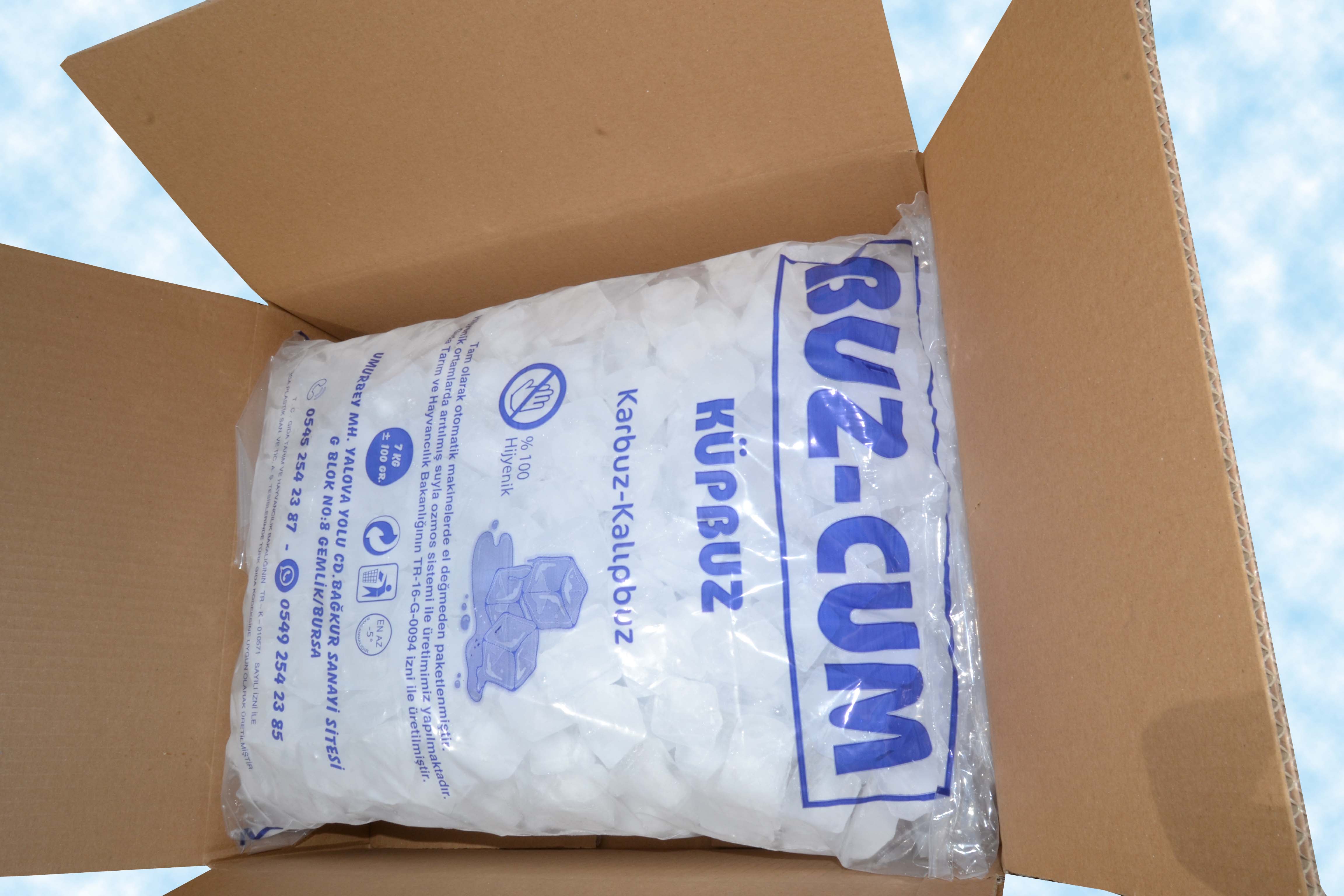 Kalıp ve yaprak buzlarımız 20 kg. steril ambalajda hijyenik ortamda paketlenmiş olarak satılmaktadır.5